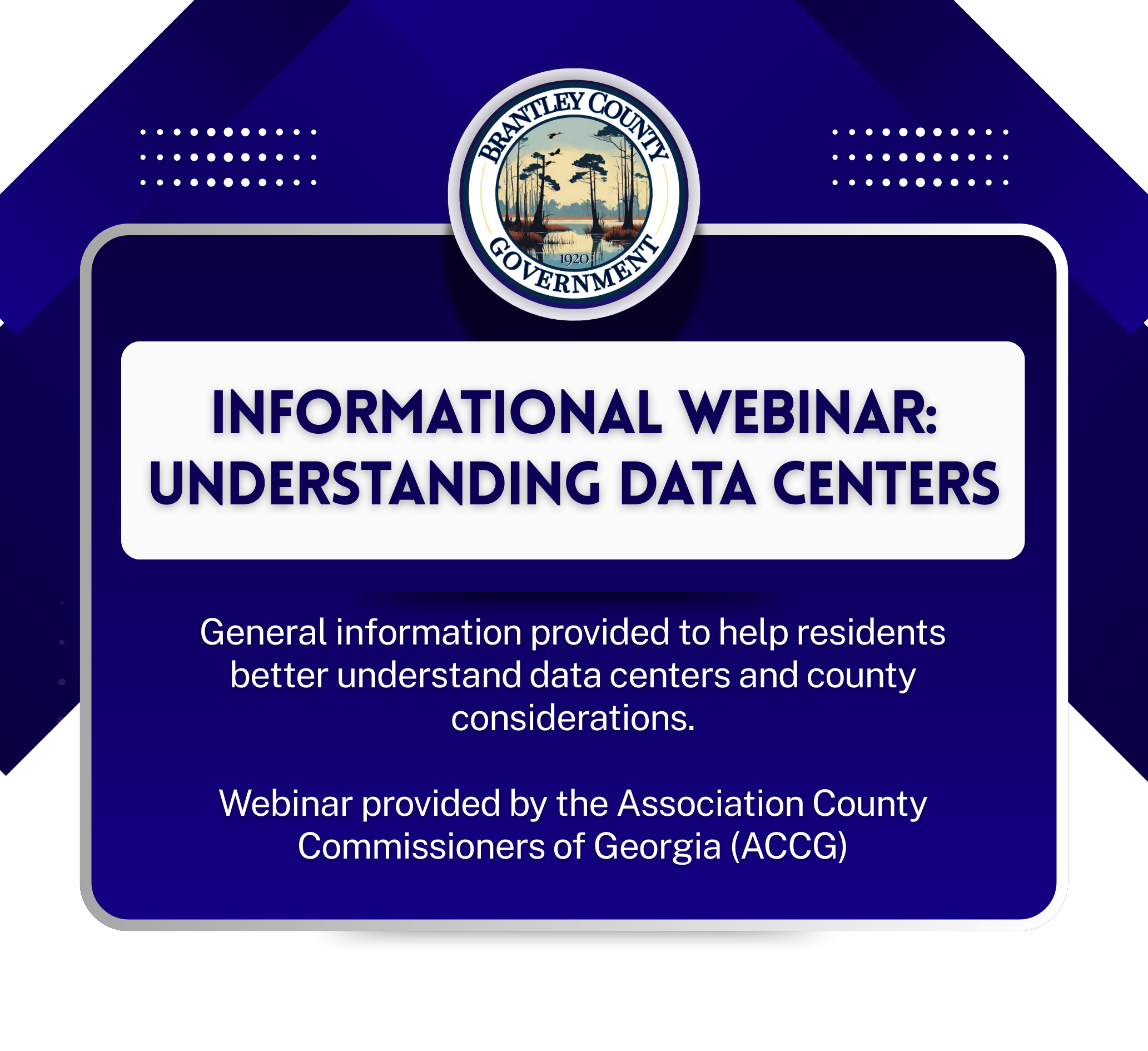 As part of our commitment to transparency, the Brantley County Board of Commissioners would like to share a webinar recently provided by the Association County Commissioners of Georgia (ACCG). This webinar offers general information about data centers and county considerations. The information is being shared to help keep our community informed.
